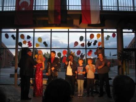 Den Abschluss der Feierlichkeiten bildete das Schulfest für unsere Kinder und ihre Eltern. Dieses begann mit einem wunderschönen Aufstieg von Luftballons mit unserem Schullogo. Mit dem Thema „Wir in unserer Schule“ beschäftigten sich die Kinder der Schulanfangsphase und mit „Wir in Europa“ die Schülerinnen und Schüler aus den 3. bis 6. Klassen, indem sie zahlreiche Stände organisierten, an denen sie u.a. verschiedene europäische Länder vorstellten. Bei europäischen kulinarischen Verlockungen konnte man sich auf selbstgefertigten Plakaten oder beim Wissensquiz über die Länder informieren oder Kinderspiele aus unseren Nachbarländern ausprobieren. Kinder und engagierte Eltern u.a. aus dem Refugium Buch beteiligten sich mit originalen Köstlichkeiten der afghanischen Küche und mit einem Bauchtanz. Auch zwei Hüpfburgen, ein Wabbelberg und andere Spaßangebote standen den Kindern zur Verfügung. Ein besonderer Höhepunkt waren die Umzüge unserer Kinder durch das angrenzende Wohngebiet mit „Dudel-Lumpi“.